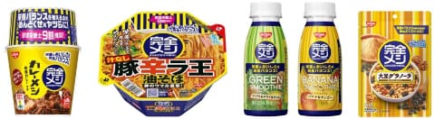左は日清食品が提案する「完全栄養食」の一例、日本人の食事摂取基準で設定された必要な33種類の栄養素をバランスよく全て摂取できる食アイテムです。